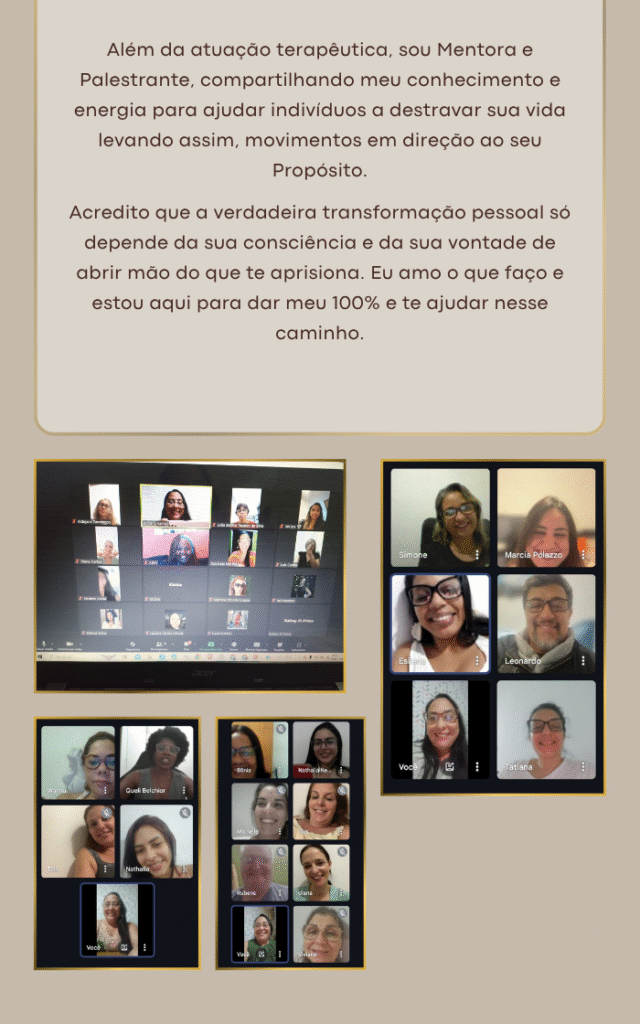 Você recebe uma mentoria que une a experiência prática de 15 anos de empreendedorismo com a profundidade da Cura Sistêmica. Isso garante não apenas o crescimento profissional, mas a Cura e Leveza necessárias para que esse crescimento seja sustentável e alinhado ao seu Verdadeiro Propósito.