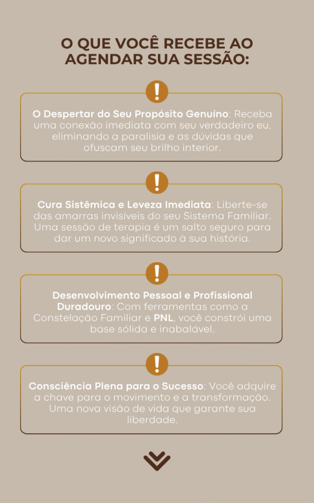 É uma abordagem profunda que busca dar um novo significado à sua história de vida e ao seu Sistema Familiar. Ela revela as amarras que causam paralisação, permitindo que você encontre a leveza e o caminho para viver o seu Verdadeiro Propósito.